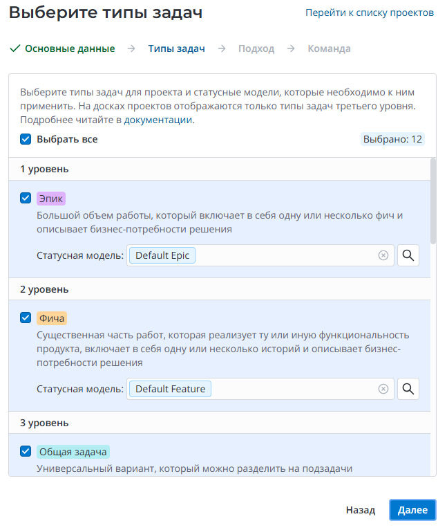 | Типы задач | Да | Укажите типы задач, которые должны использоваться в проекте. К проекту обязательно должен быть добавлен хотя бы один тип задач. Если в системе существуют пользовательские типы задач, они также будут в списке доступных опций. Если не выбрать ни один тип задач третьего уровня, доска задач будет работать некорректно. Доступные по умолчанию опции: