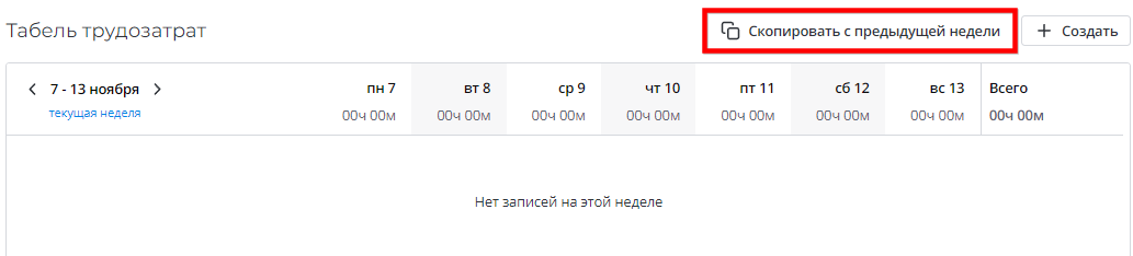 Нажмите Создать в правом верхнем углу табеля трудозатрат.