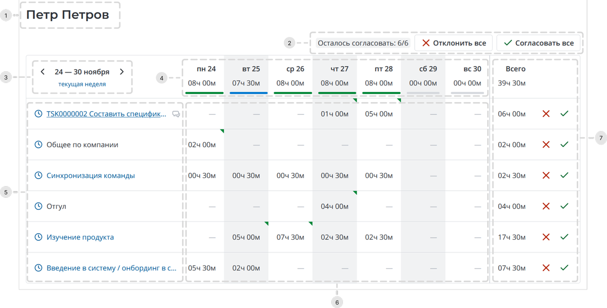 Общее время, затраченное за неделю, и кнопки согласования или отклонения отдельных карточек трудозатрат.