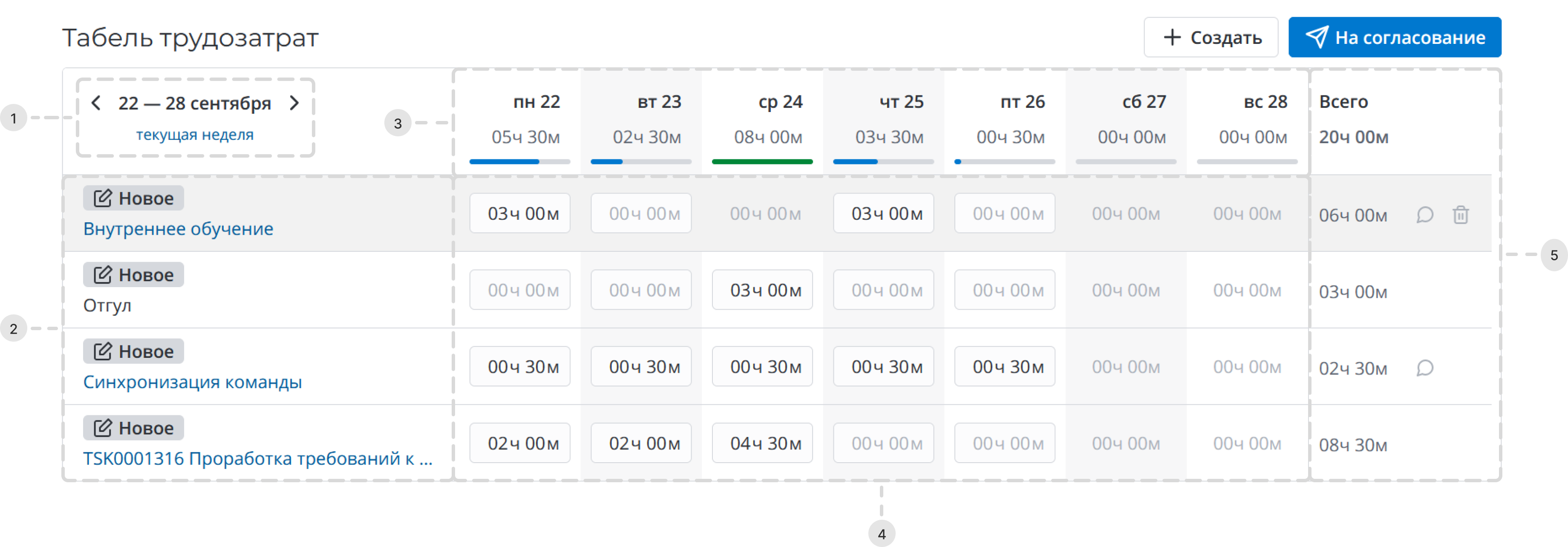 Страница Табель трудозатрат предоставляет понедельный обзор трудозатрат на задачи и другие активности, позволяет сотрудникам создавать карточки трудозатрат и отправлять их на согласование руководителю, а руководителям - согласовывать табели трудозатрат своих подчиненных.