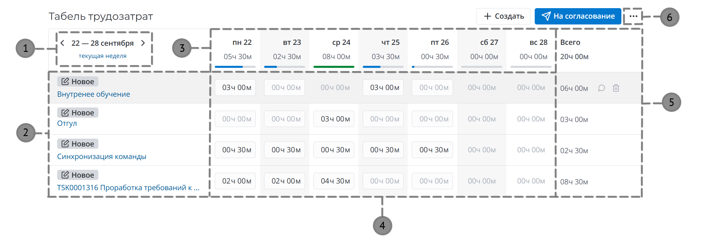 Карточки трудозатрат и статусы их согласования.