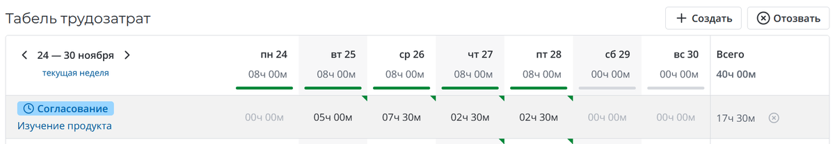 - Если руководитель согласовывает карточку трудозатрат, ее статус меняется на Согласовано.