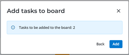 You will see the number of selected tasks in the opened Add tasks to board modal window. If you exceed the WIP limit when moving tasks to the board, a corresponding warning is displayed. Click Back to return to the previous step and change the task list. Click Add to add the selected tasks to the project board.