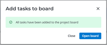 Click Close to close the modal window and stay in the Add task to board widget or click Open board to proceed to the project task board.