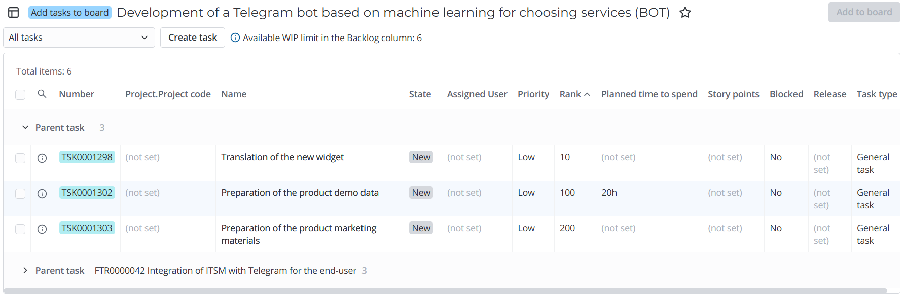 - If the Product development checkbox is selected for the project, the Product field is filled in with the current project's product in all the added tasks.