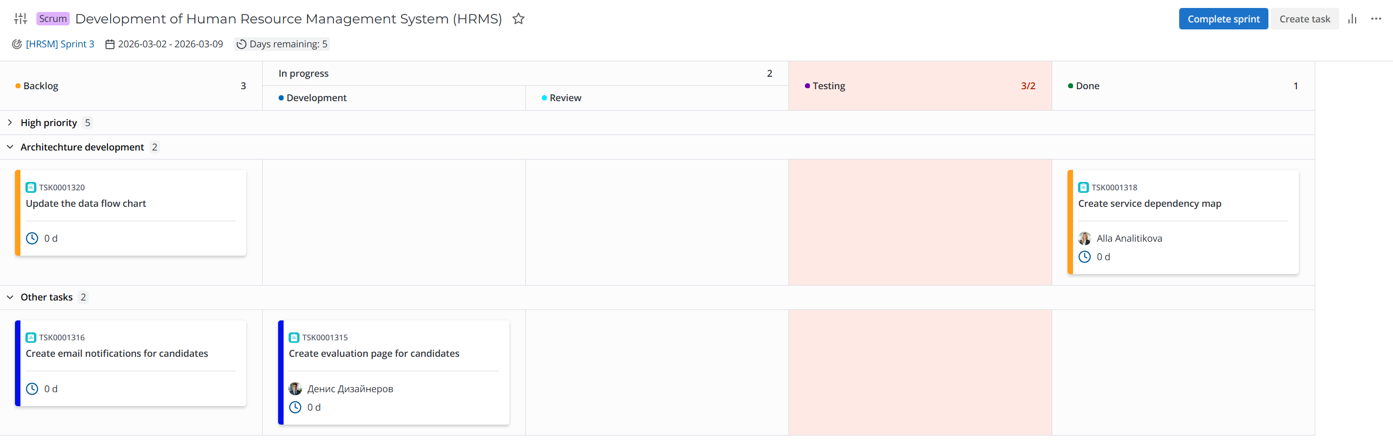 - Complete sprint – the button is displayed only if there is an active sprint at the moment. Click to open the modal window Complete sprint where you can select action for incomplete tasks, specify the related release and confirm the sprint completion.