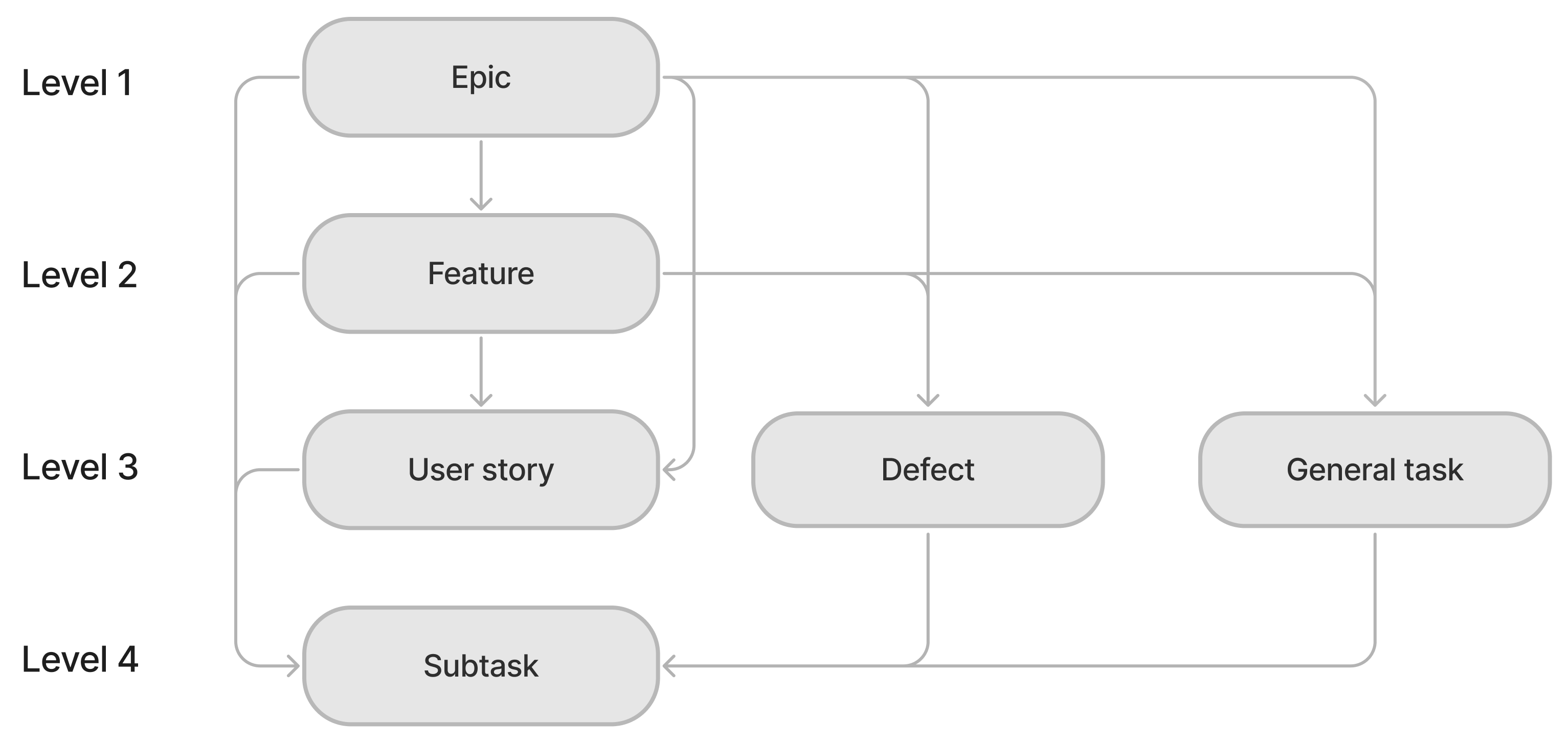 Depending on the complexity of the project, the chosen approach, and workflow specifics, you can use different task types. The levels, form fields and related lists vary between the task types, and the displaying on boards and in the other application widgets may also differ.