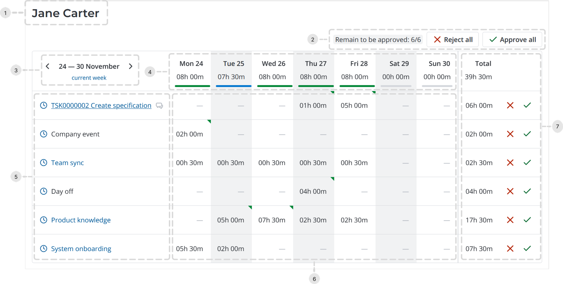 7. Total time spent during the week and the buttons to approve or reject specific timecards.